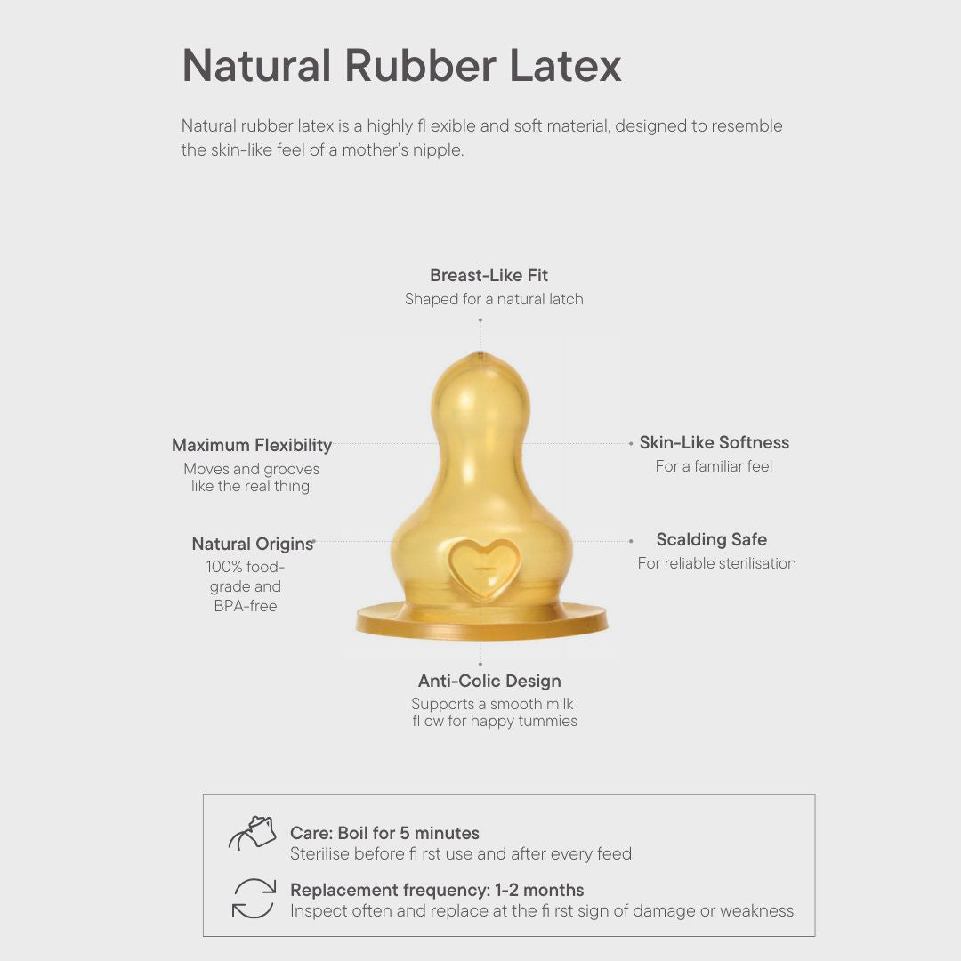 - Soft, breast-like natural rubber latex nipple closely mimics the shape, movement + feel of breastfeeding, making transitions between breast + bottle more natural