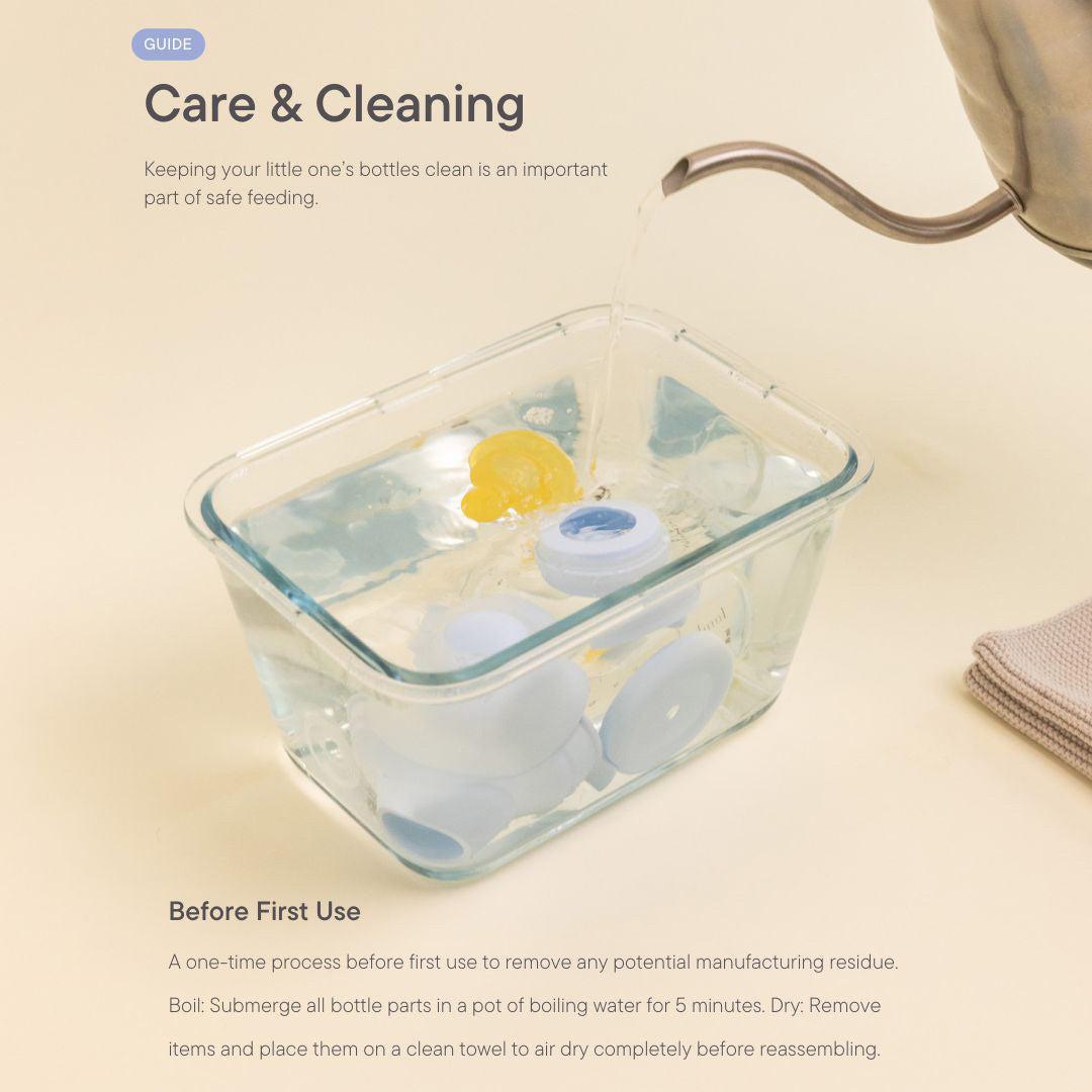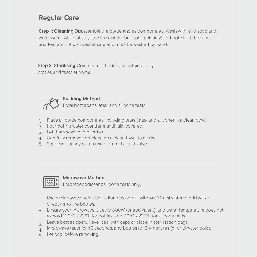 - Before first use, sterilise all bottle components in boiling water for 5 minutes