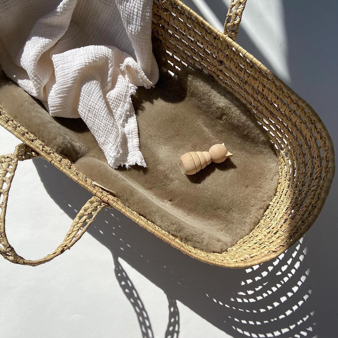 - The deep-pile sheepskin creates a naturally soothing, sink-in-soft space for baby to relax, drift off + feel supported from birth