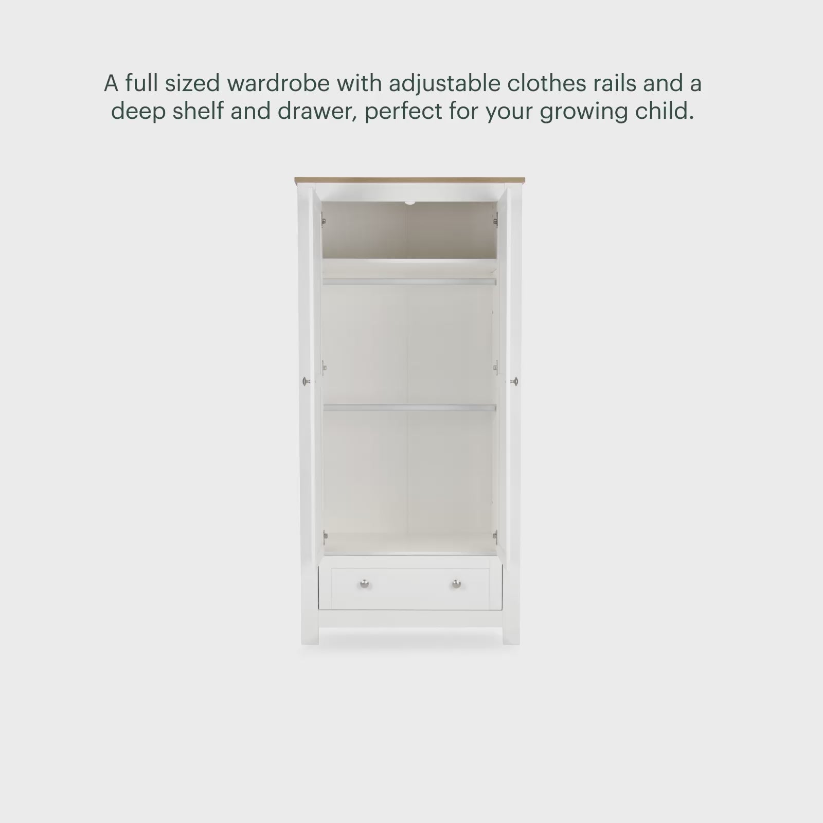 Featuring two adjustable and removable hanging rails, an internal shelf, and a spacious lower drawer, it adapts as your child grows, providing long-term storage solutions. Finished in crisp white with warm oak-effect detailing, the wardrobe combines traditional shaker style with practical functionality, creating a calm and inviting nursery environment.