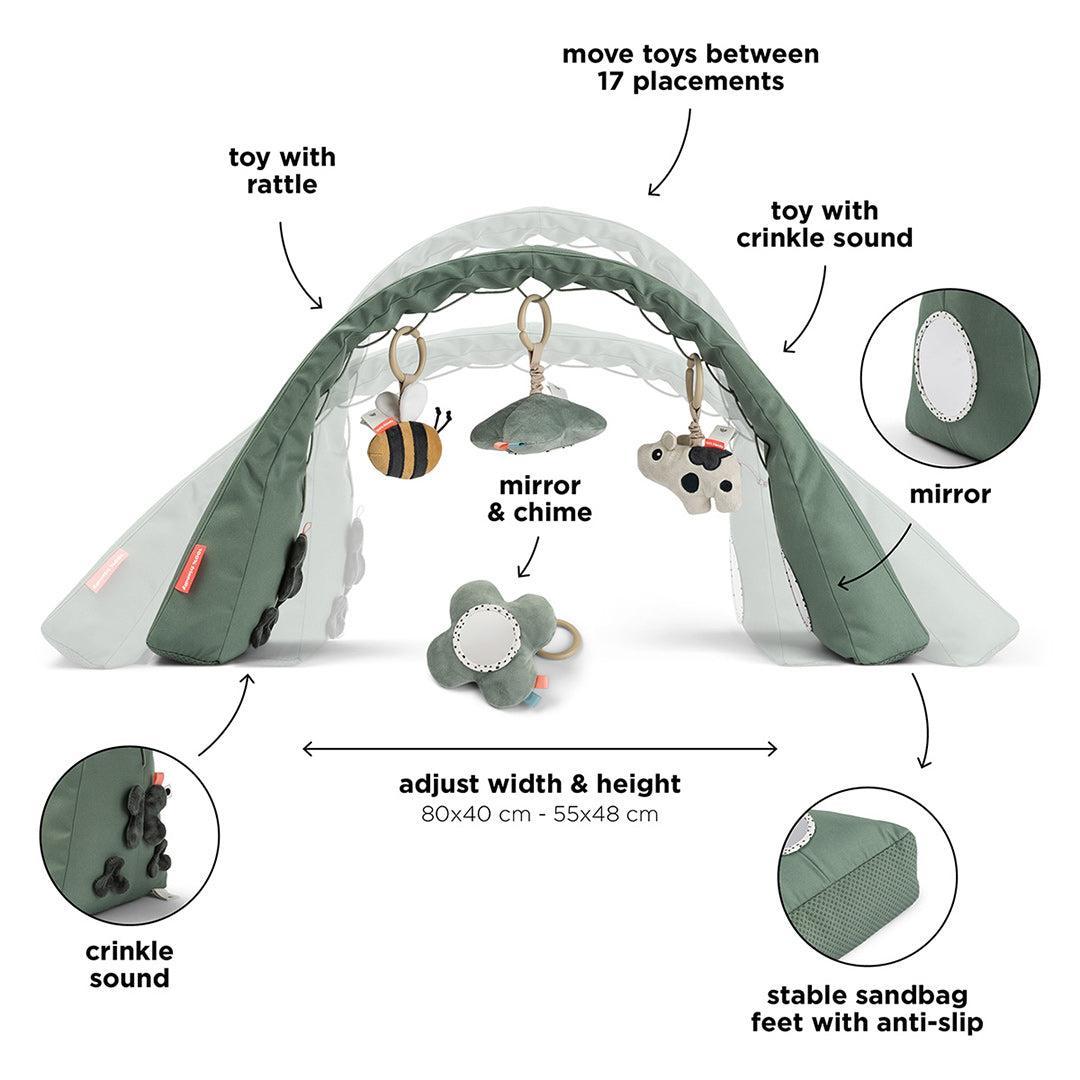 Say hello to playtime with the Done by Deer Activity Gym in the charming Tiny Farm design. This award-winning play gym is designed to support your baby's curiosity, coordination, and early development, all while keeping them happily entertained. The soft arches can be adjusted in both height and width, and with 17 different toy attachment spots, you can easily switch up the setup to match your baby’s stage and interests. Lightweight and freestanding, it’s perfect for tummy time, back time, and every little wriggle in between.