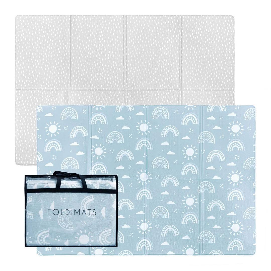 Create a soft and stylish play space with the FOLDiMATS Rainbow Confetti Playmat. One side features a charming pastel blue rainbow print, while the reverse reveals a soft grey confetti design – both beautifully neutral and perfect for any space.