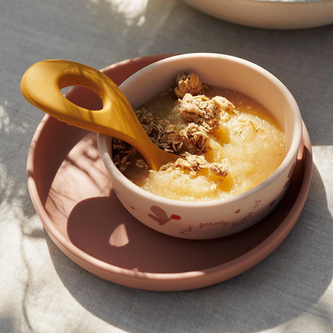 Make mealtime magical with the Liewood Vivi Printed Tableware Set in Butterfly and Apple Blossom. Designed for little hands and big food adventures, this durable silicone set includes a cup, bowl, plate, and spoon - perfect for first explorations of solid food and purees. Shatterproof, dishwasher-safe, and adorned with playful prints, the Vivi set makes everyday meals easier, fun, and full of delight for both babies and parents.
