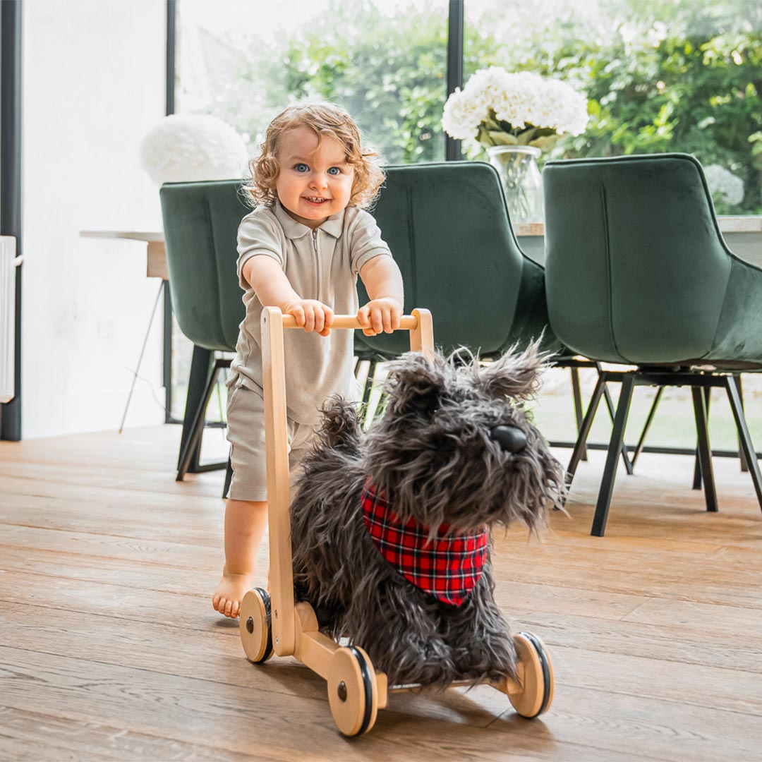 Dogs are such loyal pets including Scottie the Dog from Little Bird Told Me. He's a Push-Along Dog to help little ones learn to walk or sit on Scottie's back for a little ride. It's a great toy that's educational, ideal for children's development and also their entertainment. Let your little one take their first steps with a loyal friend. Doesn't Scottie look adorable with his checked neckerchief.