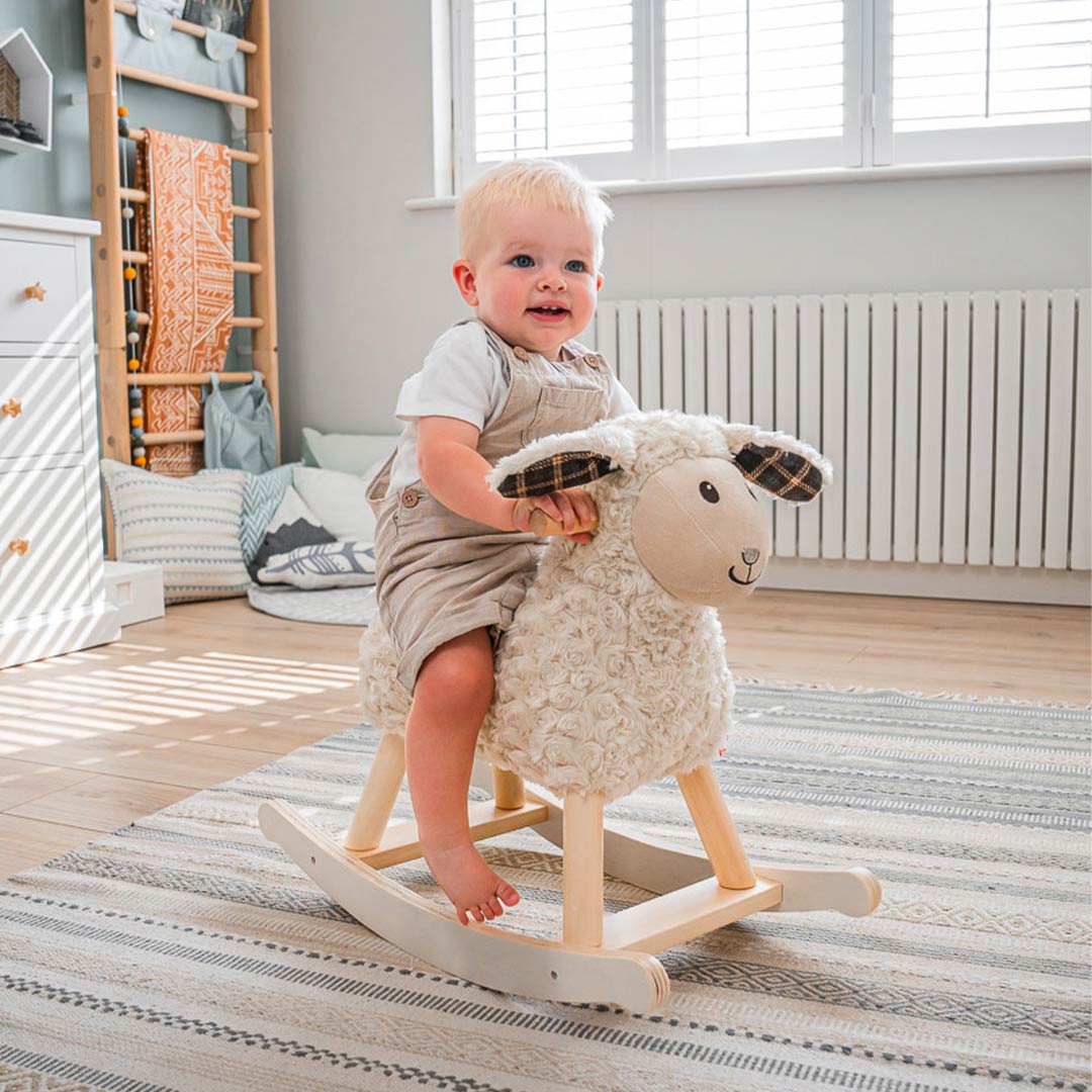 Lambert the Lamb, he's a friendly, fluffy Infant Rocker from Little Bird Told Me. Lambert has a lovely woolly coat with adorable floppy ears and is just super huggable. His ears and and tail crinkle when you touch them, which helps with your little one's senses along with providing great entertainment.