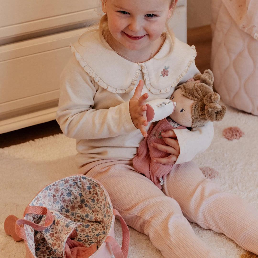 Meet Little Dutch Baby Doll Rosa, the sweet and cuddly doll that inspires nurturing play. Dressed in a removable romper and equipped with a diaper, Rosa comes with a magnetic pacifier and bottle for realistic, interactive fun. Her soft travel basket, adorned with a cheerful floral print and handy handles, makes her the perfect companion for home or on the go.