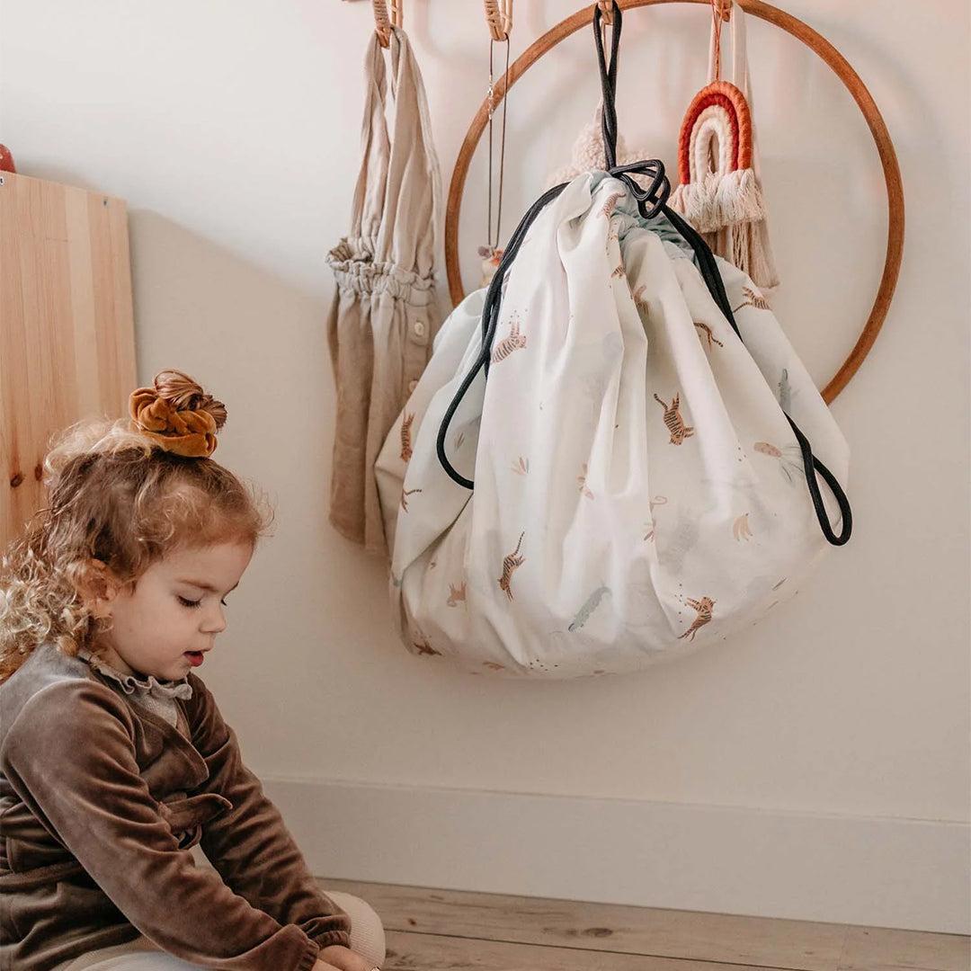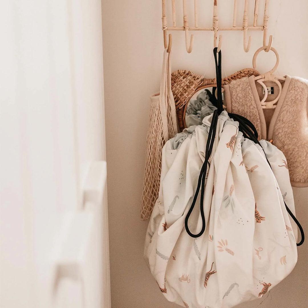 - Pull-string closure make it quick + easy to gather up toys + belongings with minimal effort
