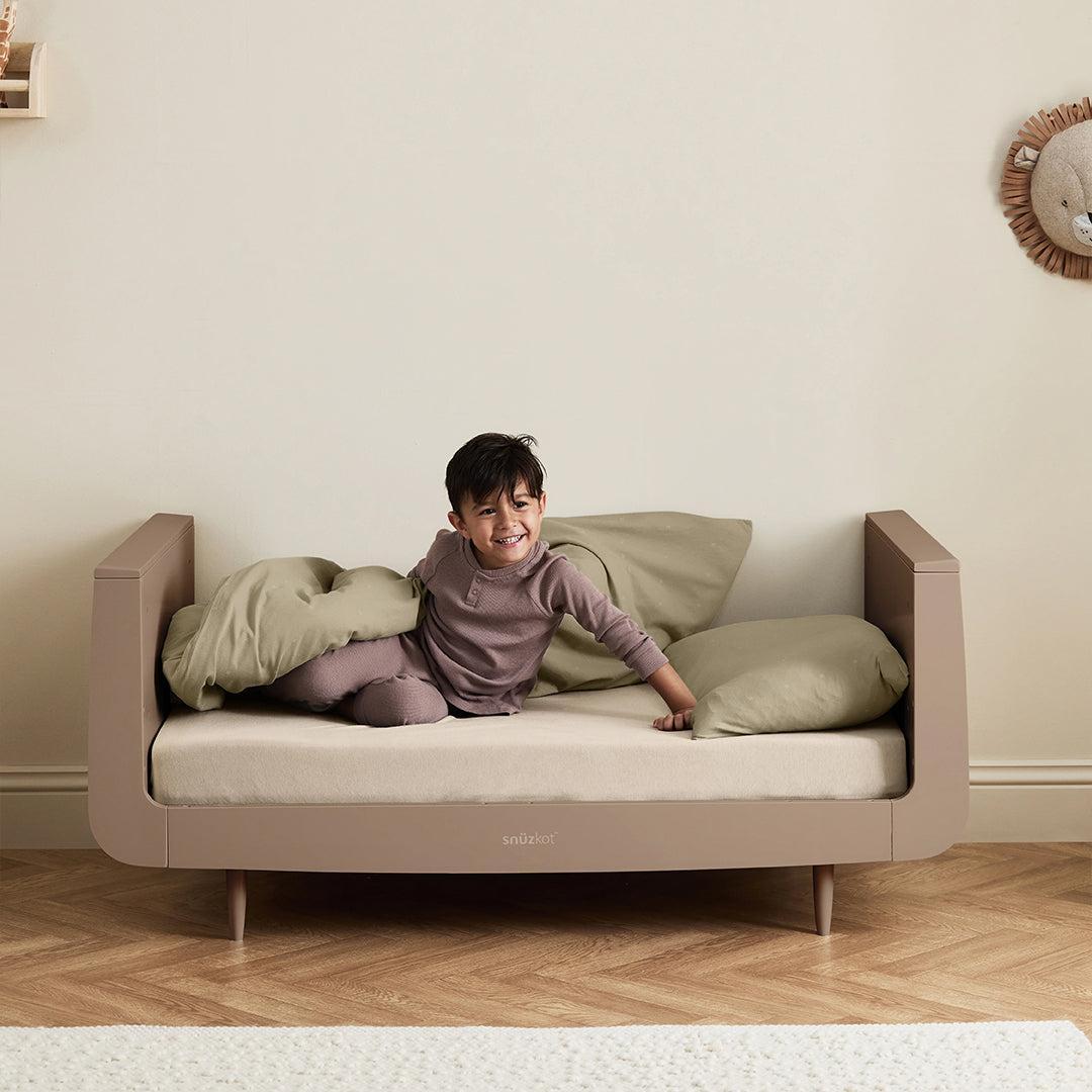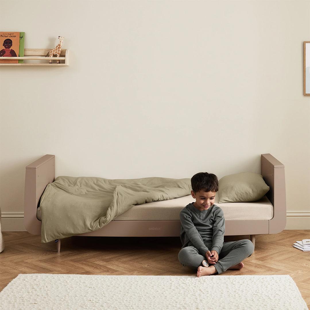 The SnuzKot Skandi Cot Bed in Mocha is a beautifully crafted, Scandi-inspired cot bed designed to grow with your little one. Thoughtfully created by sleep specialists, it transitions seamlessly from cot to toddler and finally to a junior bed, supporting every stage of your child’s development.