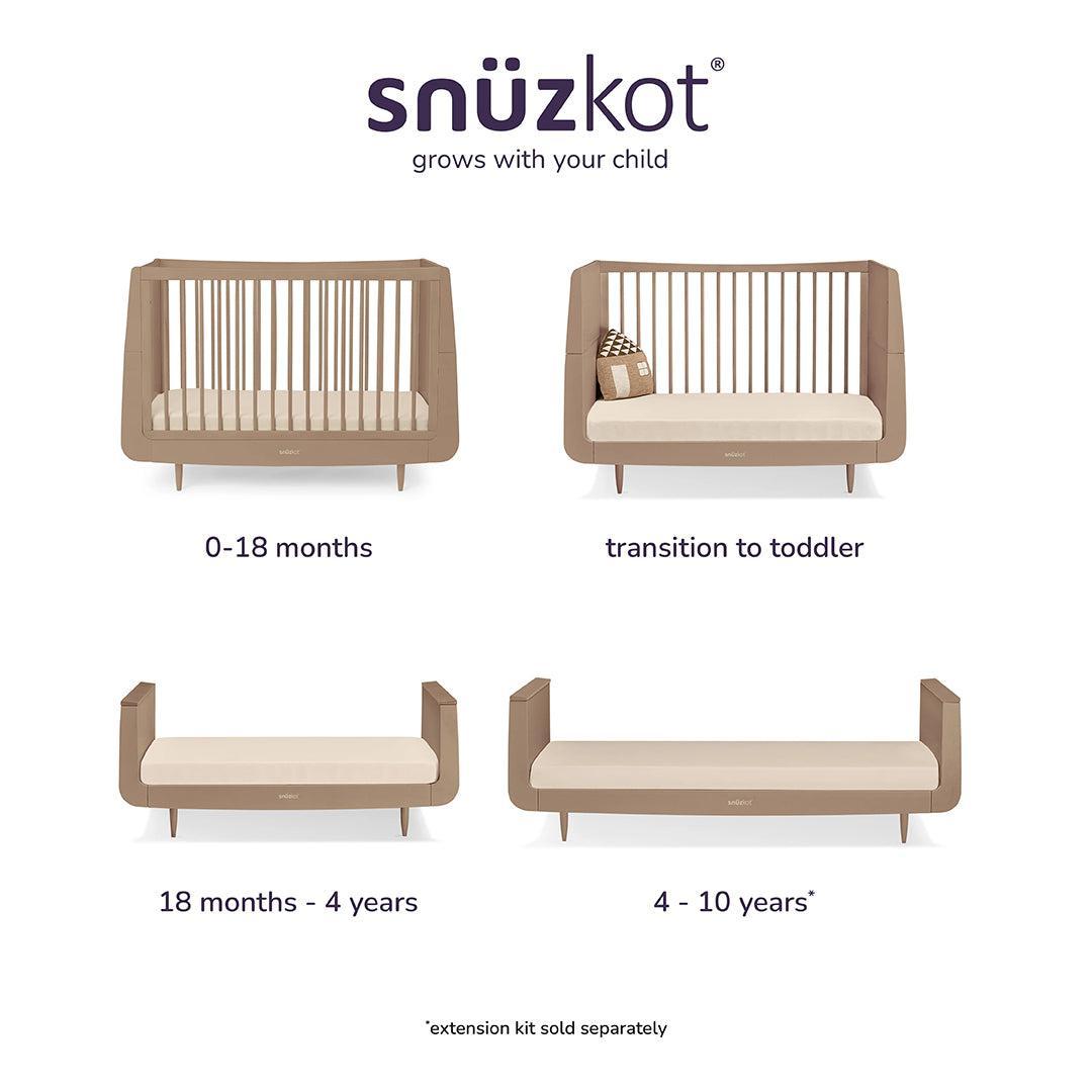 With three adjustable mattress heights and a timeless design, the SnuzKot offers a safe, comfortable, and stylish sleep space. Pair it with matching 2-piece or 3-piece sets to complete your nursery look. The junior extension kit (sold separately) allows your child to enjoy their bed long after they’ve outgrown the cot.