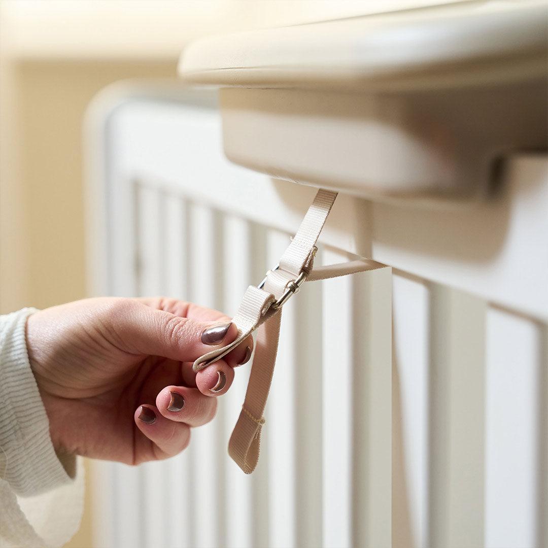 - Use on a changing table, floor, or cot bed with the included safety straps